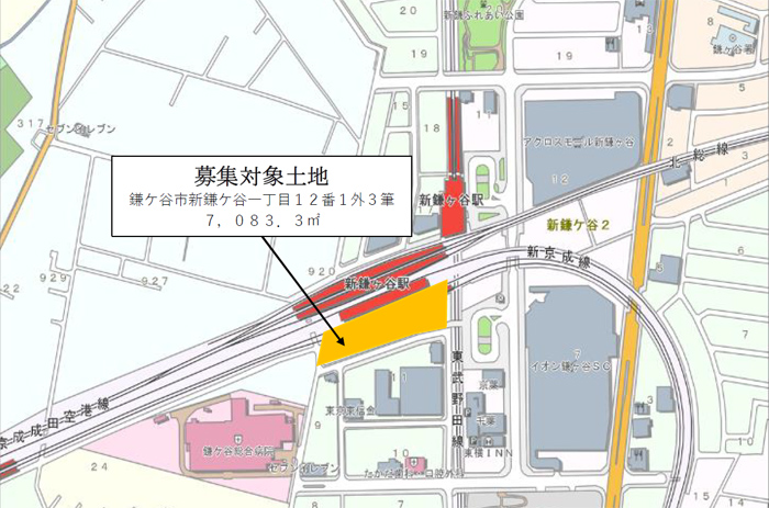 募集対象土地の所在地は鎌ケ谷市新鎌ケ谷一丁目12番1外3筆で、面積は7083.3m2。