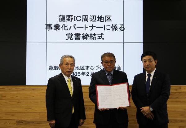 たつの市の公式ページでは、龍野IC周辺地区で土地区画整理を進める枠組み(協議会・準備組合・組合設立、竹中土木の業務代行など)が時系列で示されています。