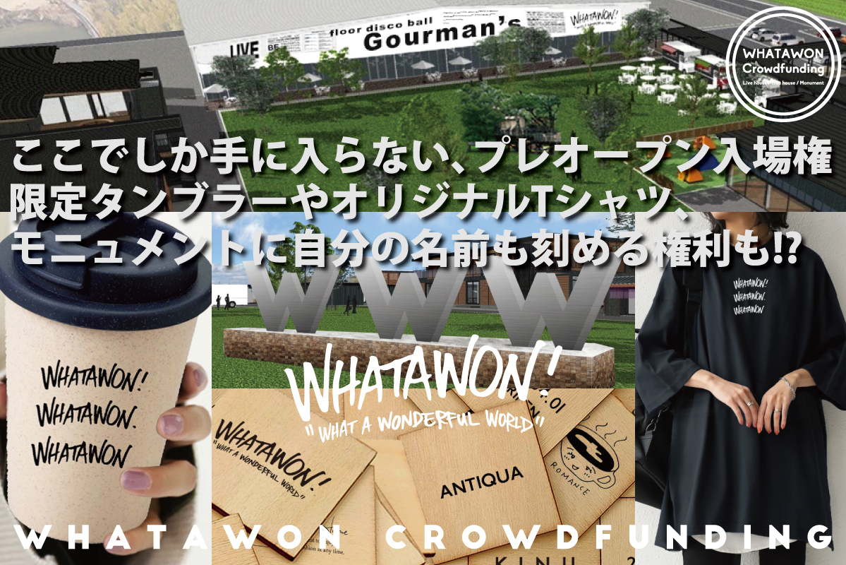 - ここでしか手に入らない、WHATAWONプレオープン入場権+限定タンブラーやオリジナルTシャツ、モニュメントに自分の名前も刻める権利も!?